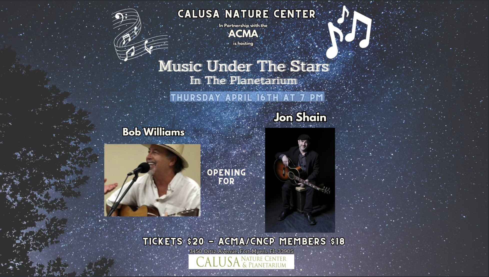 Add to Calendar 2026-04-16 19:00:00 2026-04-16 21:00:00 ACMA @ The Planetarium: Jon Shain with Bob Williams opening. The ACMA always is happy to have Jon Shain back, this time in a new location…..The Planetarium at Calusa Nature Center. Hailing from Durham, NC, Jon Shain is a veteran singer-songwriter who’s been turning heads for years with his words, his fiery acoustic guitar work, and his evolved musical style – combining improvised piedmont blues with bluegrass, swing, and ragtime. Jon has released nine solo albums to date, along with two albums with duo partner FJ Ventre, a Jon Shain Trio live album, and one album of co-writes with Joe Newberry. Shain’s newest album, Restless Soul Syndrome, recorded at Good Luck Studio this past year, was released April 9, 2024. Shain is also the author of the music books Gettin’ Handy With the Blues – a Tribute to the Legacy of W.C. Handy and Jon Shain’s Fingerstyle Guitar Method, both published by Mel Bay Publications. In 2019, Shain won the International Blues Challenge in Memphis, TN in the solo/duo category. https://jonshain.com/ ACMA Member Musician Bob Williams is opening for Jon. In the late sixties, Bob, a young guitarist from Long Island, NY, began writing his own music as soon as he mastered three chords. Drawing inspiration from Folk-Rock and Country-Rock, Bob crafted a unique sound influenced by the folk singers of the 60s and the singer-songwriters of the 70s. His writing evolved into what is now known as Americana Music, a blend of Roots, Folk, Country, Bluegrass, Blues, and everything in between. Over the past decade, Bob has performed numerous concerts, opened for national touring artists, and regularly played with The Pearl Street Band. His songs have also been recorded and released by other artists. Known for sharing the amusing stories behind his lyrics, Bob’s songs are personal, irreverent, funny, sad, and always heartfelt. His performances have been described as a mix of Neil Young and Crazy Horse with solo acoustic Bruce Springsteen. While that may be a stretch, Bob’s passion is evident in his music. In his spare time, when not writing music or performing gigs, Bob is vice president of the ACMA and actively supports our member musicians and the organization. http://www.reverbnation.com/bobwilliams2 Location Visit Fort Myers vcb@leegov.com America/New_York public