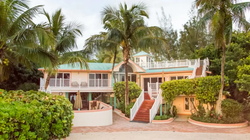 Photo of the Captiva Civic Center with green trees and pink bougainvillea flowers surrounding the building.