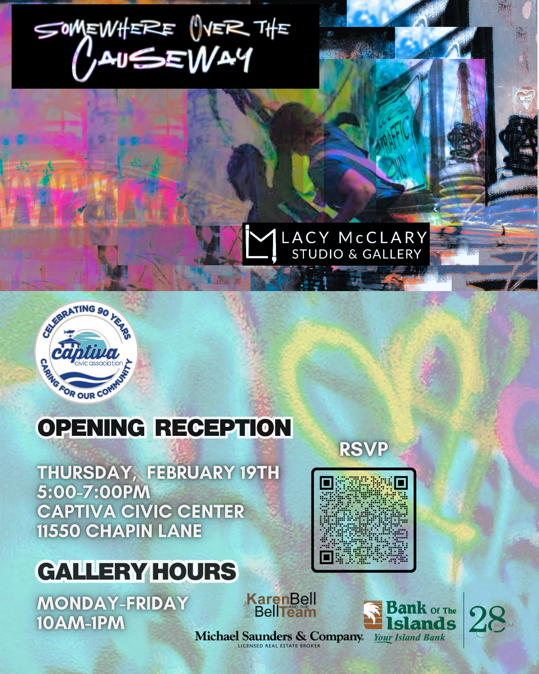 Add to Calendar 2026-02-19 17:00:00 2026-02-19 19:00:00 Art Show Opening: Somewhere Over the Causeway by Lacy McClary Opening Reception Thursday, February 19th, 2026 5:00-7:00pm On exhibition February 19th -- March 12th Gallery Times Monday-Friday 10am-1pm Opening Reception Thursday, February 19th, 2026 5:00-7:00pm Gallery Times On Exhibition February 19th -- March 12th Monday-Friday 10am-1pm Lacy McClary has created her beautiful artwork out of two local studios over the last 18 years. Recently losing both her Sanibel and Fort Myers Beach studios in Hurricane Ian has not deterred Lacy from touching the community with her color and inspiration. She recently donated her time for painting the Legacy Tower in Times Square on Fort Myers Beach to bring color, hope and life back to the beach she loves so much. She is currently accepting commission work as she transitions into her future studio. Lacy has a fierce love of the islands, the water and our local community. She loves to give back and help whenever possible. Let Lacy's abstract viewpoint guide you to look past the broken and see the beautiful. Lacy's hope is that her work inspires joy and a fresh perspective on the beauty that surrounds us. Learn more about her work: https://lacymcclary.com/ Location Visit Fort Myers vcb@leegov.com America/New_York public