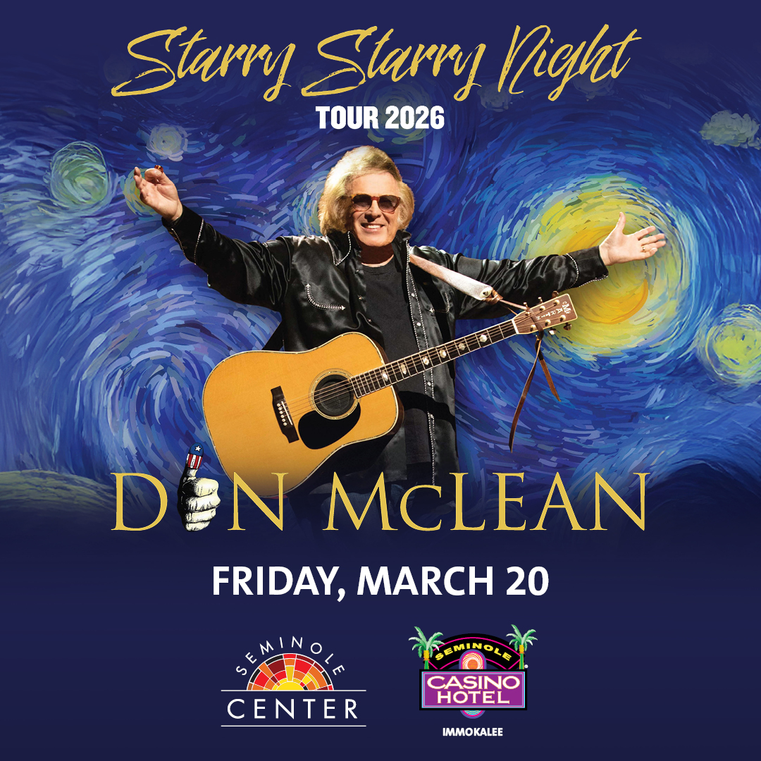 IMMOKALEE, Fla. (Aug. 12, 2025) – Singer/songwriter/guitarist Don McLean will perform his iconic hit songs at Seminole Casino Hotel Immokalee Friday, March 20 with doors opening at 7 p.m. and the show beginning at 8 p.m. Tickets are available now from Ticketmaster or at www.moreinparadise.com. Parking is free.