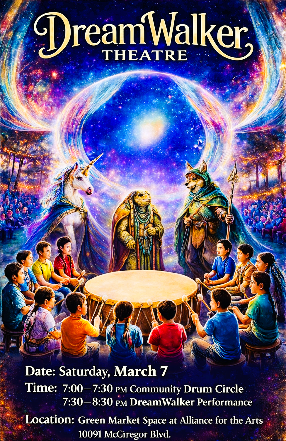 Dreamwalker Theatre, an immersive and interactive OUTDOOR experience that welcomes everyone with no experience necessary. At its heart, Dreamwalker is about unity and compassion for all beings, told through a story that captivates children and parents alike. The show combines live music, dance, and projected cinematic visuals, all woven into an uplifting journey of imagination and community.