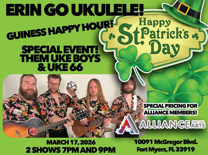 Add to Calendar 2026-03-17 19:00:00 2026-03-17 20:30:00 Erin Go Ukulele General Admission: $25.00 (Members) / $30.00 (non-Members) Erin Go Ukulele! – A St. Patrick’s Day Ukulele Celebration Get ready to strum, sing, and sip your way through St. Patrick’s Day at the Alliance for the Arts!  Join us on Tuesday, March 17, 2026, for two high-energy shows at 7 PM and 9 PM, featuring Them Uke Boys and Uke 66—two powerhouse ukulele bands known for their playful spirit, harmonies, and toe-tapping Irish flair. Celebrate with a Guinness Happy Hour, special surprises, and the luck of the Irish as these talented musicians blend humor, heart, and ukulele magic into a one-of-a-kind evening of music and merriment.  Special pricing available for Alliance members!  Alliance for the Arts – 10091 McGregor Blvd., Fort Myers, FL 33919 Raise a glass, grab your green, and join us for an unforgettable night of strums and shenanigans at Erin Go Ukes! Location Visit Fort Myers vcb@leegov.com America/New_York public