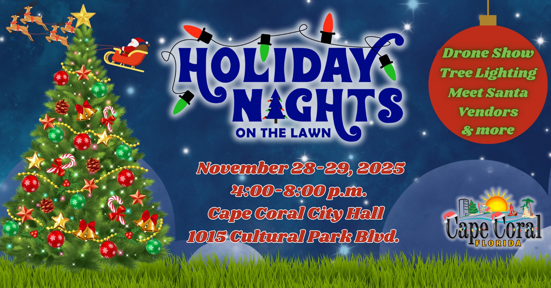 This is the City of Cape Coral's official event page for Holiday Nights on the Lawn. Join the Cape Coral Parks and Recreation Department as we kick off the holiday season with fun for all ages on the front lawn of Cape Coral City Hall. This free, family-friendly 2-day event will feature, interactive inflatables, local food trucks, an ice skating rink, a trackless train, vendors, and a visit from Santa! For our...