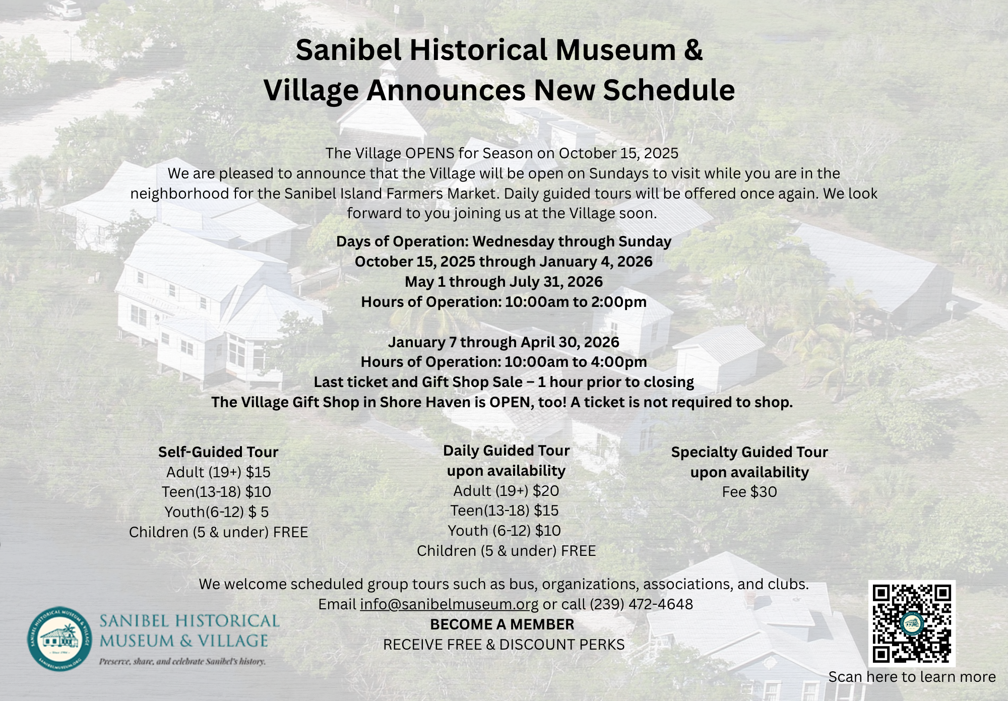 Visit the Village’s website for more information and to sign up for our E-Newsletter: www.sanibelmuseum.org. Follow us on Facebook and Instagram!