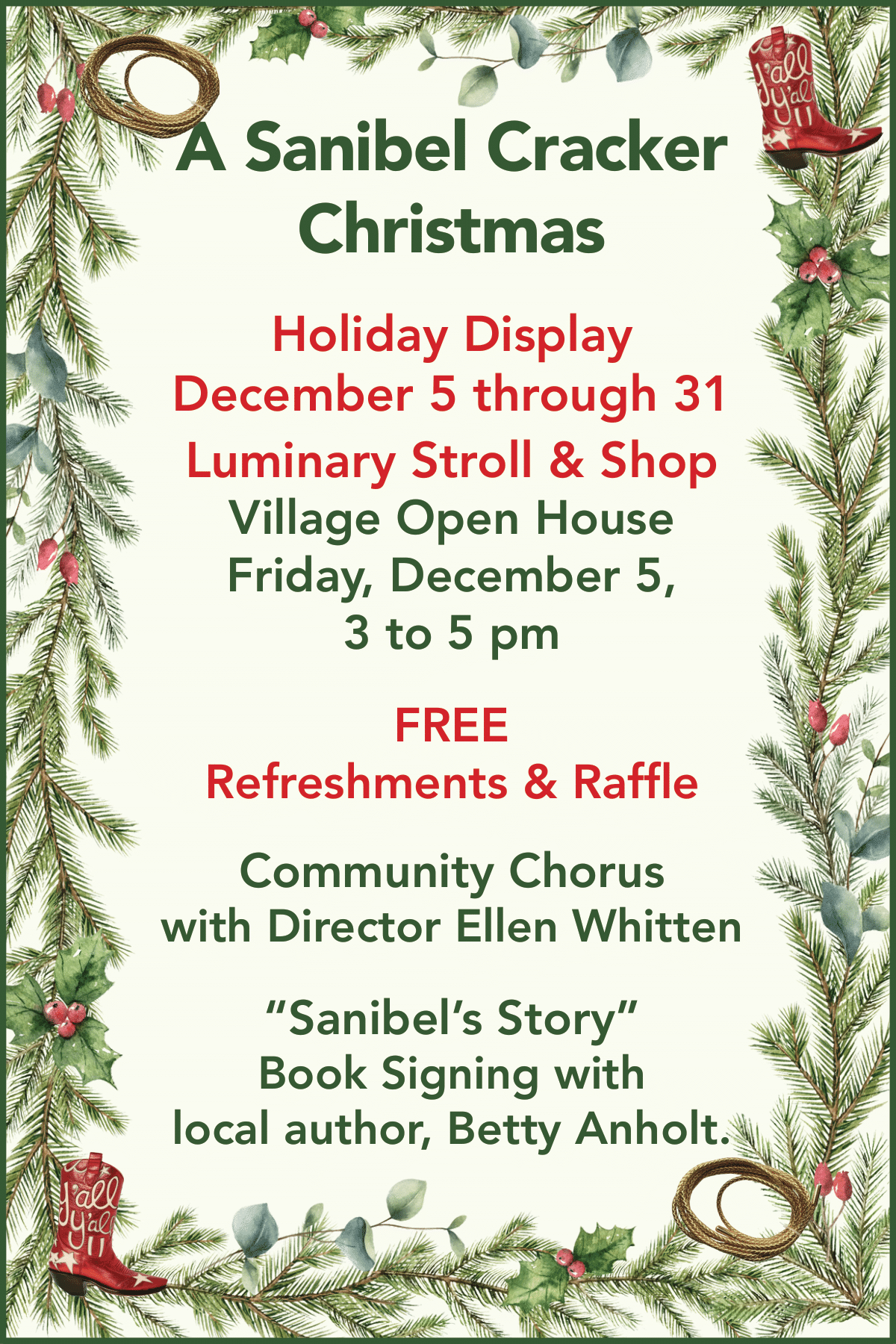 The Village invites the public to join us during a FREE Open House from 3:00pm-5:00pm on Friday, December 5th. A Sanibel Cracker Christmas display highlights Cracker inspired decorations throughout the site. A merry group of volunteers will soon be trimming trees, wreaths, and garland to adorn Bailey’s General Store, Miss Charlotta’s Tea Room, School House, Shore Haven, Morning Glories Cottage, Post Office...