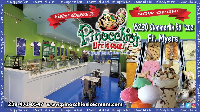Unique flavors, generous portions and loyal fans describe Pinocchio's Original Italian Ice Cream, a Sanibel tradition since 1980. Home of Pinocchio's Sanibel Krunch, Dirty Sand Dollar, Wedding Bells, Gator Stew and an ever growing repertoire of 200+ flavors, this iconic dessert shop offers a complete line of frozen confections including ice cream, gelato, sorbet, frozen yogurt, sherbet, Italian custard and...